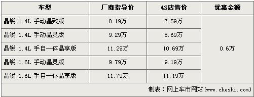 據(jù)4S店銷售人員介紹:目前晶銳全系優(yōu)惠6000元,最低僅售7.59萬。晶銳目前現(xiàn)車較為充足,顏色較齊全,個別車型無現(xiàn)車,顏色不齊全。如需要預訂車輛,最短需等2周時間,最長需等一個半月。如在店內購車做裝飾可獲8折優(yōu)惠,可保證裝飾產品質量。