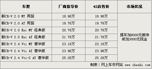 全面革新?lián)Q型的新一代CR-V將轎車的舒適性與城市SUV多功能性結(jié)合,兼顧家庭和商務(wù)需求,滿足人們對(duì)更高品質(zhì)生活的追求,在08年CR-V取得了諸多大獎(jiǎng)同時(shí),銷量一直領(lǐng)先。盡管如此,面對(duì)即將上市的國(guó)產(chǎn)RAV4,新CR-V的提車價(jià)格也在悄然減少,目前購(gòu)車仍然是需要加價(jià)提車,加價(jià)金額從4000元減少到3000元,具體行情如下: