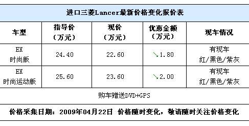 筆者近日從北京港龍基業(yè)經(jīng)銷商處獲悉,進(jìn)口三菱Lancer EX車型保持著最高2萬元的優(yōu)惠,并且近期購(gòu)車還將獲贈(zèng)DVD+GPS,現(xiàn)時(shí)尚型和時(shí)尚運(yùn)動(dòng)型現(xiàn)車充足,紅,黑,紫灰等常見顏色均有現(xiàn)車,感興趣的朋友可以與經(jīng)銷商聯(lián)系,詳細(xì)價(jià)格信息請(qǐng)見下表: