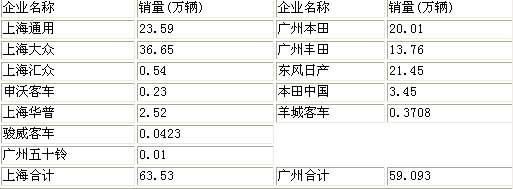 持此說法者以今年10月廣州、上海當?shù)厣a(chǎn)的乘用車銷量為依據(jù)。10月份,廣州三大乘用車企業(yè)——廣州本田、東風日產(chǎn)、廣州豐田的銷量約5.7萬輛,如果扣除在湖北襄樊生產(chǎn)的東風日產(chǎn)天籟,則廣州乘用車銷量約5.5萬輛。至于上海,盡管上海通用和上海大眾銷量合計6.5萬輛,但扣除上海通用沈陽、煙臺生產(chǎn)的1.3萬余輛,即使再計算上海華普的銷量,上海本地生產(chǎn)的汽車銷量不足5.3萬輛。