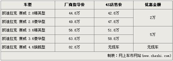 據(jù)4S店銷(xiāo)售人員介紹,目前凱迪拉克SLS賽威全系最高優(yōu)惠5萬(wàn)元。2.8L分為精英版和豪華版兩個(gè)車(chē)型,經(jīng)2萬(wàn)元優(yōu)惠后售價(jià)分別降到了42.8萬(wàn)元和47.8萬(wàn)元。3.6L車(chē)型優(yōu)惠5萬(wàn)元達(dá)到了全系的最高,優(yōu)惠后3.6精英版售價(jià)從56.8萬(wàn)元下降到了51.8萬(wàn)元,3.6豪華版售價(jià)也從63.8萬(wàn)元下降到了58.8萬(wàn)元。