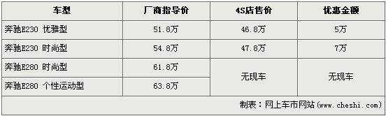 據(jù)4S店銷(xiāo)售人員介紹,奔馳E級(jí)現(xiàn)售的車(chē)型主要是E230和E280車(chē)型,其中E230時(shí)尚型的優(yōu)惠幅度為7萬(wàn)元,達(dá)到了全系的最高,優(yōu)惠后售價(jià)從54.8萬(wàn)元降到了47.8萬(wàn)元。E230優(yōu)雅型優(yōu)惠5萬(wàn)元,經(jīng)優(yōu)惠后售價(jià)從51.8萬(wàn)元下降到了46.8萬(wàn)元。銷(xiāo)售人員還介紹,E280全系店內(nèi)均無(wú)現(xiàn)車(chē),所以不在此次降價(jià)范圍內(nèi)。