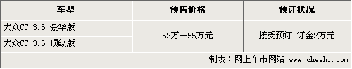 據(jù)4S店銷售人員介紹,目前大眾CC已經(jīng)可以接受消費者預訂,訂金為2萬元。4月份4S店首批車型將到店,預計這款車的售價在52萬-55萬區(qū)間,但具體官方價格尚未公布。配置方面,這款車分為豪華版和頂級版,氙氣大燈、電動折疊加熱外后視鏡、定速巡航及電子駐車制動器等均是兩款車型的標準配置。但由于價位以及市場定位的不同,大眾CC轎跑頂級版配備了更加高級的無鑰匙啟動及鎖定系統(tǒng)好和30GB內(nèi)置硬盤及觸摸屏語音控制。