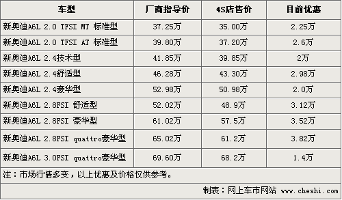 新款奧迪A6L通過外觀和安全等方面的改款升級,在同級別車型中擁有了更高的性價比,入門級車型價格更能夠比拼寶馬3系等對手。根據(jù)網(wǎng)上車市價格監(jiān)測系統(tǒng)顯示,目前奧迪A6L全系優(yōu)惠幅度有進(jìn)一步增加,2.0入門車優(yōu)惠后僅售35萬,具體車型以及價格如下: