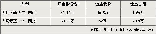 吉普大切諾基是吉普家族中極具個(gè)性的一款大尺寸車型,在推出3.7L排量車型后,消費(fèi)者的選擇空間更大,同時(shí)帶給駕乘者完全不同的駕駛體驗(yàn)。根據(jù)網(wǎng)上車市價(jià)格監(jiān)測系統(tǒng)顯示,目前大切諾基的售價(jià)最高可優(yōu)惠到7.69萬元,具體車型以及價(jià)格如下: