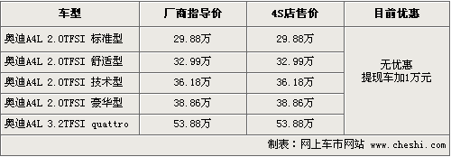 筆者從北京地區(qū)經(jīng)銷(xiāo)商處了解到,目前奧迪A4L現(xiàn)車(chē)供應(yīng)比較緊張,現(xiàn)車(chē)數(shù)量非常少,款式主要集中在2.0T舒適版和3.2兩款車(chē),各4S店供車(chē)情況有一定差異。部分店提現(xiàn)車(chē)仍然需要加1萬(wàn)元現(xiàn)金,或者在店內(nèi)做1萬(wàn)元裝飾。消費(fèi)者如果訂車(chē)的話(huà),需要交5000元左右訂金,等待一個(gè)月時(shí)間提車(chē)。