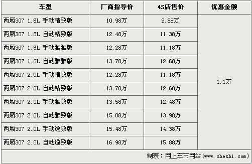 據(jù)東風標致經(jīng)銷店銷售人員介紹,兩廂標致307分為1.6L和2.0L兩種排量,目前全系優(yōu)惠1.1萬元,入門車型的1.6L 手動精致版原廠商指導價為10.98萬元,經(jīng)優(yōu)惠后僅售9.88萬元,排量稍大的2.0L排量的低配車型手動精致版經(jīng)優(yōu)惠后售價為11.18萬元。