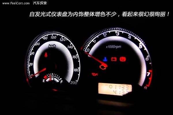 比較夢(mèng)幻的是絢麗的儀表。黑色的表底下白色泛出的刻度以及紅色的指針很是顯眼。面積雖然不大,但為整個(gè)內(nèi)飾都呈現(xiàn)出一種比較有檔次的效果。上面的擋板保證了其自發(fā)光的設(shè)定時(shí)刻都不會(huì)因?yàn)殛柟獾脑蚨绊懽x取信息,當(dāng)然如果面積更大一些的話,那感覺就會(huì)更好一些。