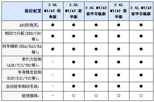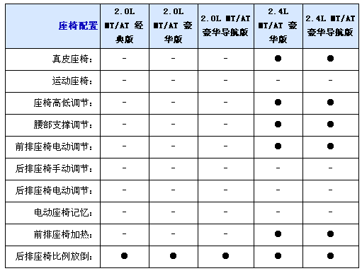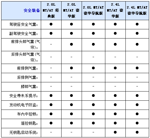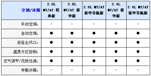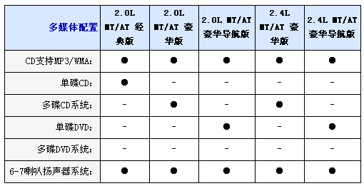 內(nèi)飾方面2.0L均配備織物座椅,而2.4L車型則采用真皮坐椅并且配備電加熱座椅,并且2.0L配備6向手動調(diào)節(jié)駕駛座椅,而2.4L配備8向電動調(diào)節(jié)并且代腰部支撐的駕駛座椅,不過副駕駛?cè)囅抵粯?biāo)配4向手動調(diào)節(jié)座椅,另外入門級車型只配備CD播放器,2.0L和2.4L豪華型采用6CD播放器,而2.0L和2.4L豪華導(dǎo)航型配備DVD播放器和6.5寸寬屏液晶顯示器;包括導(dǎo)航功能,全系標(biāo)配6喇叭揚聲器、多功能方向盤自動分區(qū)空調(diào)和后排足部出風(fēng)口。