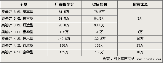 據(jù)奧迪4S店銷售人員介紹,目前銷售的奧迪Q7包括了3.6和4.2排量共7款車型。消費(fèi)者在購(gòu)買(mǎi)的同時(shí)可以選擇個(gè)性化選裝配置,其中包括了座椅顏色,內(nèi)飾顏色,剎車盤(pán),音響等一系列配置,據(jù)介紹,選擇個(gè)性化配置后,車價(jià)將有相應(yīng)增加。同時(shí)消費(fèi)者可以直接購(gòu)買(mǎi)原車型,目前全車系3.6排量三款車優(yōu)惠3萬(wàn)元現(xiàn)金,豪華版優(yōu)惠4萬(wàn)。而4.2舒適型最低可優(yōu)惠到135萬(wàn),降幅達(dá)23萬(wàn)。目前4S店現(xiàn)車主要以黑色為主,內(nèi)飾有灰色、米色可供選擇。