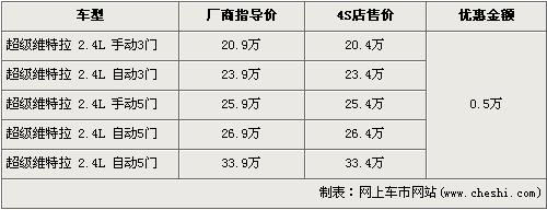 據(jù)4s店銷售人員介紹,目前店內(nèi)銷售的新超級(jí)維特拉全系優(yōu)惠5000元。低配的3門版2.4L 5速手動(dòng)車型最低售價(jià)降為20.4萬(wàn)元,而排量稍大采用5速自動(dòng)變速器的5門版3.2L車型經(jīng)優(yōu)惠后售價(jià)也降為33.4萬(wàn)元,是全系最高價(jià)。店內(nèi)現(xiàn)車顏色方面,新超級(jí)維特拉有黑、灰、白三個(gè)顏色供消費(fèi)者選購(gòu)。