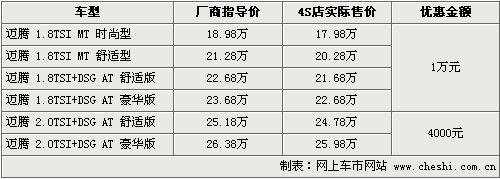 筆者從一汽大眾北京地區(qū)經(jīng)銷商處了解到,目前銷售的邁騰大多為DSG版車型,其中1.8T車型可以現(xiàn)車優(yōu)惠1萬元,2.0排量優(yōu)惠4000元,如果消費者選擇在4S店內(nèi)做一條龍服務(wù),還將有一定幅度的優(yōu)惠。除新款DSG版車型外,部分4S店還有少量的老款邁騰銷售,現(xiàn)車主要為黑色、銀色等。