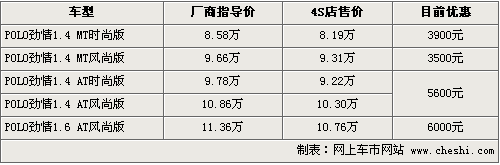 據(jù)4S店銷售人員介紹,目前POLO勁情現(xiàn)車比較緊張,只有少數(shù)車型有現(xiàn)車供應(yīng),同時(shí)各款車型在價(jià)格上的優(yōu)惠幅度也不一樣。1.4入門級(jí)車型優(yōu)惠現(xiàn)金3900元,其他各款優(yōu)惠從3500元-6000元不等。另?yè)?jù)銷售人員介紹,消費(fèi)者如果預(yù)訂車型的話,需要先交訂金排隊(duì),一個(gè)月左右才能順利提到車現(xiàn)車。