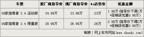 據(jù)經(jīng)銷商銷售人員介紹,09款指南者的官方廠商指導價下調(diào),運動版的售價從24.99萬元下降到了23.99萬元,限量版的售價從28.99萬元下降到了26.99萬元,并且經(jīng)銷商處還有優(yōu)惠,最高優(yōu)惠達到了2.99萬元。09款指南者運動版與限量版經(jīng)優(yōu)惠后,售價分別降為了23萬元和26萬元。銷售人員還介紹,指南者現(xiàn)車店內(nèi)比較緊張,錯過這批現(xiàn)車的消費者需交1萬元現(xiàn)金,下個月才可提車。