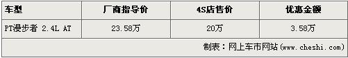 據(jù)北京克萊斯勒經(jīng)銷店銷售人員介紹,近期購買PT漫步者的消費(fèi)者可以得到3.58萬元的優(yōu)惠。在售的PT漫步者為2.4L自動(dòng)檔車型,售價(jià)為23.58萬元。經(jīng)優(yōu)惠后,PT漫步者的售價(jià)從23.58萬元下降到了20萬元。銷售人員還說,店內(nèi)現(xiàn)車顏色主要是黑色和銀色,欲購買其他顏色的消費(fèi)者需交定金1萬元,最快下周就可提車。