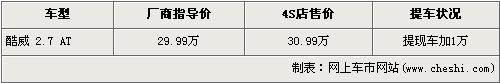 據(jù)4S店銷售人員介紹,在售的道奇酷威為2.7L自動(dòng)檔車型,售價(jià)為29.9萬元。近期購買酷威的消費(fèi)者如要在經(jīng)銷店提現(xiàn)車,需在廠商指導(dǎo)價(jià)29.9萬元的基礎(chǔ)上加價(jià)1萬元才可提車。銷售人員還介紹,近期購買酷威的車主還可以享受到3年或8萬公里的超長質(zhì)保政策。