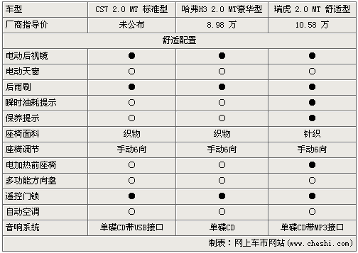 在舒適配置上,三款車(chē)的配置基本相當(dāng),都配有電動(dòng)后視鏡、手動(dòng)6向調(diào)節(jié)的針布座椅、普通空調(diào)、單碟CD音響,不過(guò)售價(jià)比較高的瑞虎還有比較人性化的瞬時(shí)油耗提示、保養(yǎng)提示,三款車(chē)都配置了遙控門(mén)鎖,方便駕駛者操作車(chē)輛。