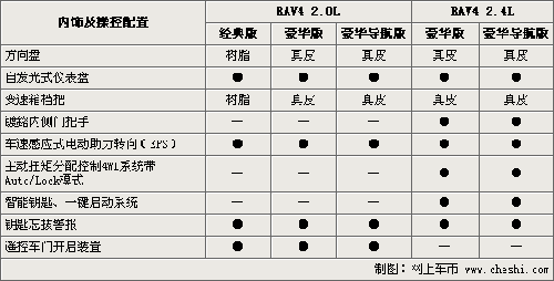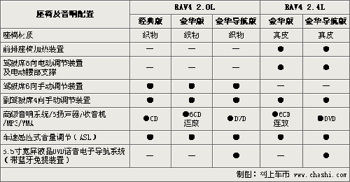RAV4入門級(jí)車型的音響系統(tǒng)為單碟CD,豪華版車型為6CD連放,而導(dǎo)航版車型則配備了6.5英寸的寬屏液晶DVD語(yǔ)音電子導(dǎo)航系統(tǒng)并提供了藍(lán)牙免提裝置。此外,RAV4 2.4L車型與2.0L車型在功能方面的差異還在于,座椅的材質(zhì)、前排座椅的加熱裝置與駕駛席座椅調(diào)節(jié)的形式上。