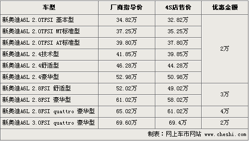 據(jù)4S店銷售人員介紹,目前新奧迪A6L現(xiàn)售的車型主要是黑色款,其他款顏色如銀色均需要預(yù)訂。訂金為1萬元,需要等待兩個月時間。消費(fèi)者現(xiàn)在購車可以享受一定的現(xiàn)金優(yōu)惠幅度,其中2.0、2.4和3.0排量優(yōu)惠2萬元。2.8舒適型和豪華型優(yōu)惠3萬,2.8頂配車型可優(yōu)惠到4萬。