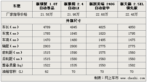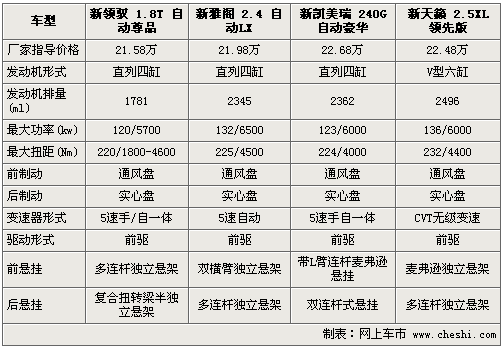 新領(lǐng)馭全系7款車型已于上月底正式上市,售價(jià)為16.98-30.38萬元。除前臉和尾部的全新設(shè)計(jì)外,老款1.8T引擎經(jīng)過重新調(diào)教最大功率達(dá)120Kw。而在此中級(jí)車細(xì)分市場(chǎng)中,新雅閣、新凱美瑞和新天籟均占據(jù)著一定的市場(chǎng)份額。下面通過對(duì)四款價(jià)格相近車型進(jìn)行詳實(shí)解析,以便為您的購車提供一定的參考。