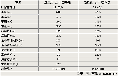 國(guó)產(chǎn)漢蘭達(dá)和現(xiàn)代新勝達(dá)均屬于一個(gè)級(jí)別的城市SUV車型,兩款車型均是2.7排量的高配車型,售價(jià)相差了4200元。在車身尺寸方面,國(guó)產(chǎn)漢蘭達(dá)在車長(zhǎng)、車寬、均超過了現(xiàn)代新勝達(dá),這一點(diǎn)保證了其內(nèi)部橫向空間及頭部空間的寬敞。在軸距方面,豐田漢蘭達(dá)比新勝達(dá)長(zhǎng)出了90mm,這一點(diǎn)意味著漢蘭達(dá)的腿部空間將會(huì)優(yōu)越于新勝達(dá)。兩款車型的離地空間都達(dá)到了203mm,確保了它們?cè)趶?fù)雜路面上的道路通過性。越野性能方面,國(guó)產(chǎn)漢蘭達(dá)要優(yōu)越于新勝達(dá),這點(diǎn)從接近角和離去角的數(shù)據(jù)就可以看出來。豐田漢蘭達(dá)的前后輪距和輪胎橫截面數(shù)據(jù)都要大于新勝達(dá),這表明在操控性能上漢蘭達(dá)將會(huì)略勝一籌。漢蘭達(dá)和新勝達(dá)的油箱均達(dá)到了75升上下,可以為其提供良好的續(xù)航能力。