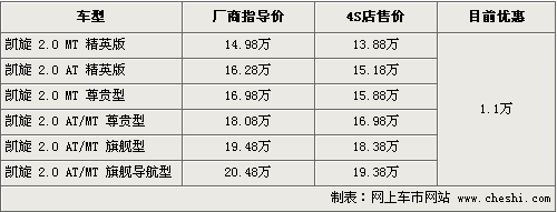 據(jù)4S店銷售人員介紹,目前購(gòu)買凱旋可以優(yōu)惠1.1萬(wàn)元,目前現(xiàn)車主要都是自動(dòng)檔車型,主要有黑色、灰色可供選擇,而手動(dòng)精英型和手動(dòng)尊貴型則需要接受預(yù)訂,訂金為1000元,10個(gè)工作日可提車。