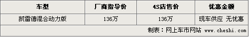 筆者從凱迪拉克北京地區(qū)經(jīng)銷商處了解到,目前凱雷德混合動(dòng)力版車型已經(jīng)到店,現(xiàn)車主要為黑色。據(jù)銷售人員介紹,混合動(dòng)力版車型只有白色和黑色兩款車,現(xiàn)在白色款還需要預(yù)訂,售價(jià)為136萬,現(xiàn)車暫無優(yōu)惠。