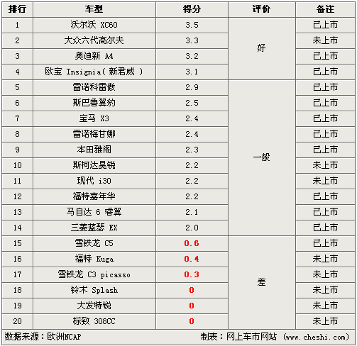 從上圖中的歐洲NCAP測(cè)試統(tǒng)計(jì)中可以看出,以安全著稱(chēng)的沃爾沃確實(shí)有實(shí)力,XC60以3.5的高分位列第一名,緊隨其后的大眾新高爾夫和奧迪新A4,歐寶Insignia(即新君威)也獲得了3.1分,四款車(chē)都獲得了好的評(píng)價(jià),其中除了新高爾夫即將國(guó)產(chǎn)之外,其他三款都已在國(guó)內(nèi)市場(chǎng)銷(xiāo)售。有好的就有差的,即將國(guó)產(chǎn)的雪鐵龍C5僅獲0.6分,而鈴木Splash、大發(fā)特銳、標(biāo)致308CC意外的評(píng)為零分,在碰撞中毫無(wú)保護(hù)可言甚至可能會(huì)對(duì)頸部造成危險(xiǎn),而鈴木Splash還將在昌河鈴木投產(chǎn),不知到時(shí)能否獲得改進(jìn)。