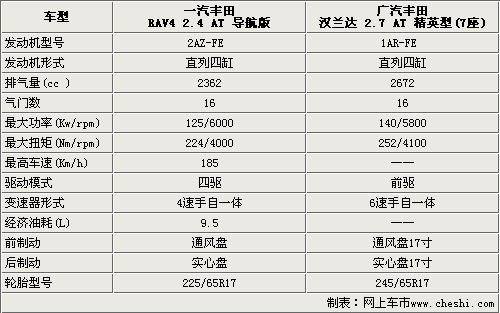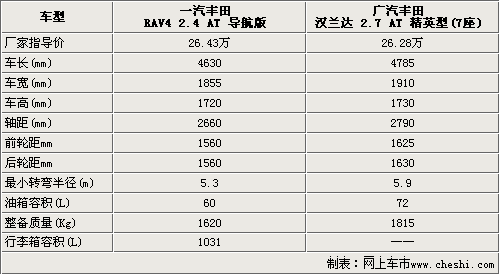SUV市場一直是車市中增長比較強(qiáng)勁的一股力量,尤其是受到都市人喜愛的城市SUV車型。在新車層出不群的同時(shí),競爭也在逐漸加大。豐田汽車就看準(zhǔn)了這一市場,在今年上半年分別于一汽豐田和廣汽豐田,投產(chǎn)了兩款城市SUV車型:RAV4和豪華城市SUV漢蘭達(dá),售價(jià)分別為18.98萬—26.43萬和24.88-42.98萬元。從兩款車型的售價(jià)上看,在25萬這個(gè)價(jià)格區(qū)間都有車型銷售。那么這兩款同品牌、同價(jià)位不同級(jí)別的城市SUV,它們都各自有什么特點(diǎn)和優(yōu)勢呢?為了能讓您可以更加清楚地了解它們,我們選取了一汽豐田RAV4 2.4自動(dòng)導(dǎo)航版和廣汽豐田漢蘭達(dá)2.7精英型7座這兩款車型,來做一個(gè)全方位的對(duì)比。一汽豐田RAV4 2.4自動(dòng)導(dǎo)航版售價(jià)為26.43萬元,廣汽豐田漢蘭達(dá)2.7精英型7座的售價(jià)為26.28萬元,兩款車型的售價(jià)僅相差了1500元。