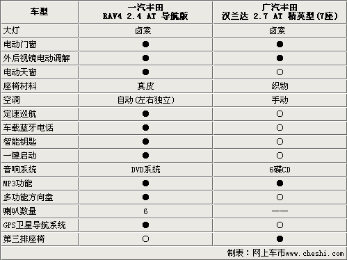 一汽豐田RAV4 2.4自動導(dǎo)航版和廣汽豐田漢蘭達2.7精英型7座的舒適配置相差比較懸殊。RAV4 2.4自動導(dǎo)航版屬于RAV4車系中的頂配車型,舒適配置可謂是應(yīng)有盡有,電動天窗、真皮座椅、自動空調(diào)、定速巡航、多功能方向盤、DVD影音系統(tǒng)等設(shè)備都成為了標(biāo)準(zhǔn)配置。而漢蘭達2.7精英型7座屬于該車系中的低配車型,在舒適配置方面盡顯于基本使用。但在空間利用上漢蘭達還是比較具有優(yōu)勢的,首先漢蘭達最多可以承載7名乘客,而且室內(nèi)空間可以靈活多變,放倒比例達到了4:2:4,可以更加有效的方便乘客置放大件物品。