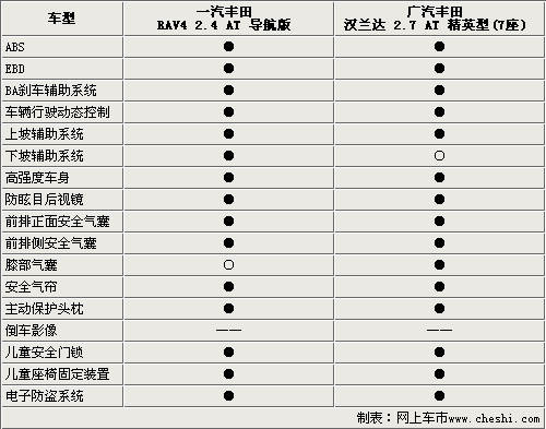 從上表我們可以看到,在電子主動安全系統(tǒng)的配備中,ABS+EBD、動態(tài)穩(wěn)定系統(tǒng)和6安全氣囊均成為了一汽豐田RAV4 2.4自動導(dǎo)航版和廣汽豐田漢蘭達2.7精英型7座的標(biāo)準(zhǔn)配置。但仔細(xì)看下來它們還是略有不同。豐田RAV4再配備了上坡輔助系統(tǒng)的同時,還配備下坡輔助系統(tǒng),確保車輛在斜坡上能以穩(wěn)定速度的行駛。而漢蘭達則是配備了膝部氣囊,可以有效的降低事故發(fā)生后對乘客的傷害。比較遺憾的是這兩款車型均沒有配備倒車輔助系統(tǒng)。