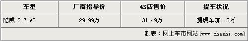 據(jù)4S店銷售人員介紹,在售的道奇酷威為2.7L自動檔車型,售價(jià)為29.9萬元。近期購買酷威的消費(fèi)者如要在經(jīng)銷店提現(xiàn)車,需在廠商指導(dǎo)價(jià)29.99萬元的基礎(chǔ)上加價(jià)1.5萬元才可提車,加價(jià)后的價(jià)格增長為31.49萬元。銷售人員還介紹,店內(nèi)只有一輛酷威銀色現(xiàn)車。