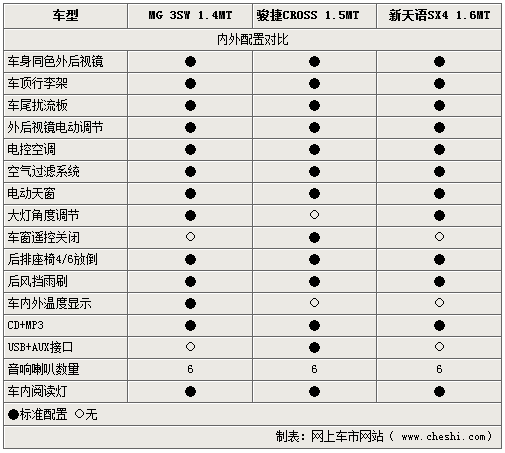為了令駕乘者得到更多的便利,三車均在內(nèi)外設(shè)計了多項豐富便利的配置,在車輛外部的設(shè)計方面三車均有自己的特點,在保證了高性能的前提下,多項豪華配置均出現(xiàn)在三款跨界車型之上,內(nèi)部的多項設(shè)計對乘員的舒適及娛樂需要兩者也都考慮的相當周全,帶MP3的CD播放器以及自動空調(diào)等一應(yīng)俱全。