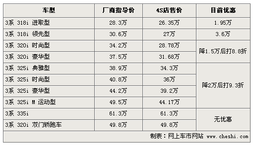 據(jù)4S店銷售人員介紹:目前寶馬3系全部大幅降價(jià),最高降幅達(dá)到5.8萬元。寶馬318系列目前低配車需要預(yù)訂,訂車周期為1個(gè)月,高配車型可優(yōu)惠3.6萬,對(duì)于一款上市未滿一個(gè)月的新車而言,有著較高的性價(jià)比。寶馬320系列兩款車型可以降1.5萬后優(yōu)惠8.8折,325系列可優(yōu)惠2萬后打9.3折。寶馬335i和320i雙門轎跑車無任何優(yōu)惠,預(yù)定車需等6個(gè)月。目前寶馬3系系列下10款車型現(xiàn)車均不多,預(yù)訂最短需等10天左右,最長需等半年。