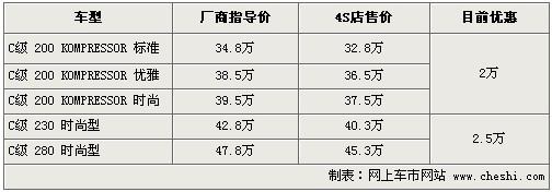 據(jù)4S店銷售人員介紹:目前奔馳C優(yōu)惠幅度較大,全系購車送全險(xiǎn),同時(shí)C200K優(yōu)惠達(dá)2萬元,C230、C280優(yōu)惠更是達(dá)到2.5萬元。不過目前現(xiàn)車較少,有些車型需要預(yù)訂,預(yù)定周期為1個(gè)月左右。C200K優(yōu)雅型與C230時(shí)尚型現(xiàn)車較少,C230時(shí)尚型甚至將要停產(chǎn),由于這兩款車價(jià)格與其它3款車型價(jià)格相近,并配置有些令人不滿,所以將要停止生產(chǎn)。