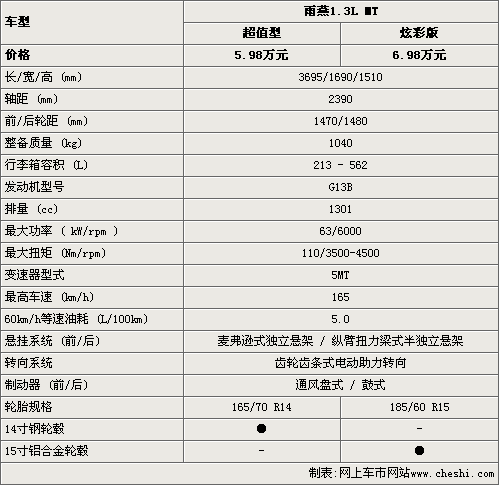 雨燕1.3L超值型的售價(jià)為5.98萬(wàn)元,比炫彩版要便宜一萬(wàn)元,在車身尺寸和動(dòng)力性能方面,這款新車都沒(méi)有任何變化。但雨燕1.3L超值型只配備了14寸鋼輪轂和14寸輪胎,而炫彩板則配備的是15寸鋁合金輪轂是15寸輪胎?偟膩(lái)說(shuō),雨燕超值型整車的性能基本上并沒(méi)有變化。