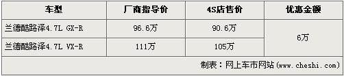 據(jù)經(jīng)銷商銷售人員介紹,豐田-蘭德酷路澤分為4.0L和4.7L兩種排量,由于4.0L車型的尾氣排放是歐III標(biāo)準(zhǔn),沒有達(dá)到北京施行的歐IV標(biāo)準(zhǔn),所以北京限賣,店內(nèi)沒有4.0L車型。4.7L車型分為GX-R版和VX-R版,目前購買蘭德酷路澤的消費(fèi)者可以得到6萬元的優(yōu)惠。經(jīng)優(yōu)惠后,GX-R版售價降為了90.6萬元,VX-R版售價降到了105萬元。銷售人員還介紹,店內(nèi)沒有蘭德酷路澤現(xiàn)車,預(yù)購買者需交訂金1萬元,約等一個半月可提車。