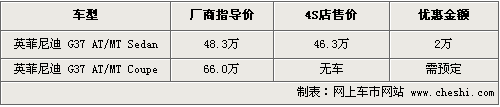 目前銷售的英菲尼迪G37只有四門版車型在售,廠商指導(dǎo)價(jià)格為48.3萬元,現(xiàn)在購(gòu)車可以優(yōu)惠現(xiàn)金2萬元,優(yōu)惠后售價(jià)為46.3萬元,店內(nèi)有銀色等款現(xiàn)車供應(yīng),同時(shí)兩門版車型尚沒有現(xiàn)車,需要預(yù)訂,訂金為1萬元。