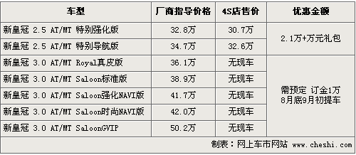 筆者從一汽豐田經(jīng)銷商處了解到,目前新皇冠的價格出現(xiàn)了較大的降幅,最高優(yōu)惠達到2.1萬元,同時在7月31日之前購車的客戶贈送萬元的禮包,包括了三種不同的禮包。目前皇冠2.5L兩款車型有黑色、白色現(xiàn)車供應,而3.0排量基本沒有現(xiàn)車,據(jù)銷售人員介紹,目前主要以2.5L銷售為主。如果訂車的話,需訂金1萬元,8月底9月初能夠提到現(xiàn)車。