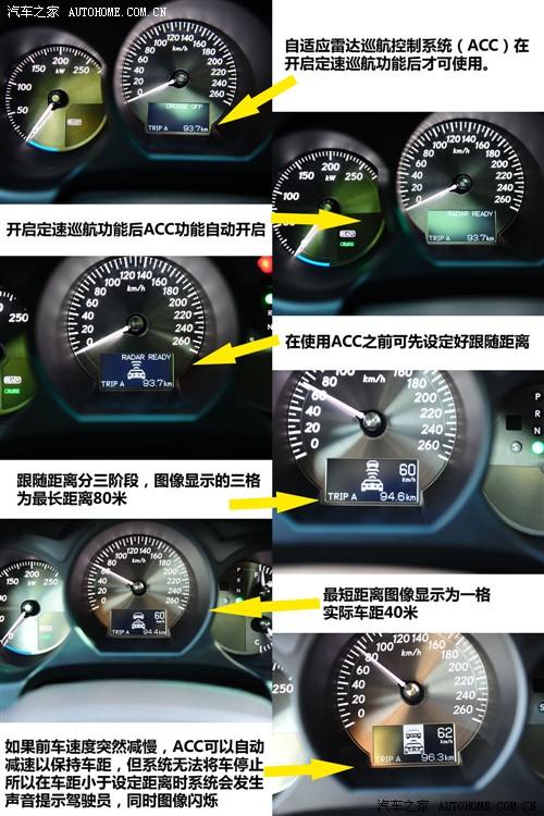 這款GS450h帶有自適應(yīng)雷達(dá)巡航控制系統(tǒng)(ACC),所謂自適應(yīng)就是根據(jù)駕駛員設(shè)定的距離值,電腦讓車輛始終保持在這個(gè)距離上。首先,要開啟這個(gè)功能需要先打開定速巡航開關(guān),這時(shí)儀表盤中央顯示屏上除了會(huì)出現(xiàn)巡航激活燈外,還有一個(gè)RADAR READY的字樣;此時(shí)可以對(duì)距離值進(jìn)行設(shè)定,距離值分為3級(jí),圖像上顯示一格為最近,三格為最遠(yuǎn),距離值分別是40米、60米、80米。