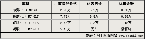 據(jù)4S店銷(xiāo)售人員介紹,目前銳歐全系優(yōu)惠幅度并不大,現(xiàn)售主要是1.4L排量車(chē)型,由于賽拉圖兩廂和三廂完全能夠滿(mǎn)足消費(fèi)者的購(gòu)車(chē)需要,所以幾乎沒(méi)有消費(fèi)者選購(gòu)1.6L排量的銳歐。1.4L三款車(chē)優(yōu)惠價(jià)格從0.68萬(wàn)元到1.18萬(wàn)元不等,同時(shí)店內(nèi)有銀色、紅色等現(xiàn)車(chē)可供選購(gòu),現(xiàn)車(chē)顏色較為齊全,消費(fèi)者選擇的空間比較大。