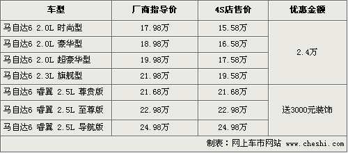 據(jù)4S店銷售人員介紹,目前馬自達(dá)6銷售的車型除了新款睿翼外,還有老款車型有現(xiàn)車供應(yīng),消費(fèi)者到店購車可得到2.4萬元的現(xiàn)金優(yōu)惠,車價(jià)最低僅為15.58萬元。新款馬自達(dá)6睿翼雖然沒有現(xiàn)金方面優(yōu)惠,但購車可以贈(zèng)送3000元左右的裝飾,消費(fèi)者可以根據(jù)需求選購。