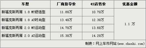 據(jù)長安福特經(jīng)銷商處銷售人員介紹,目前購買兩廂?怂沟南M(fèi)者可以得到1.1萬元的優(yōu)惠。兩廂新款?怂狗譃1.8L和2.0L兩種排量,入門級車型的1.8L手動舒適版經(jīng)優(yōu)惠后售價下降到了10.79萬元。而高配的2.0L自動運(yùn)動版售價同樣也降到了14.29萬元。