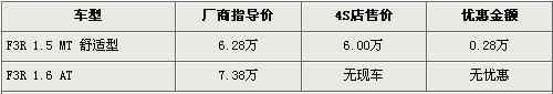 據(jù)比亞迪汽車(chē)北京地區(qū)4S店銷(xiāo)售人員介紹,目前北京在售的比亞迪F3R只有1.5L手動(dòng)舒適版車(chē)型,并且廠商指導(dǎo)價(jià)也從6.08萬(wàn)元回升到了6.28萬(wàn)元。目前購(gòu)買(mǎi)此車(chē)的消費(fèi)者可以得到2800元的優(yōu)惠,經(jīng)優(yōu)惠后售價(jià)降到了6萬(wàn)元。