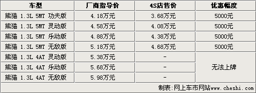 據(jù)吉利汽車(chē)4S店銷(xiāo)售人員介紹,熊貓1.3L手動(dòng)擋車(chē)型目前都有現(xiàn)車(chē)銷(xiāo)售,而自動(dòng)擋雖然已經(jīng)上市,但由于北京地區(qū)無(wú)法上牌,所以還沒(méi)有現(xiàn)車(chē)抵達(dá)北京市場(chǎng),預(yù)計(jì)最早會(huì)在今年年底前解決無(wú)法上牌的問(wèn)題。目前熊貓1.3L手動(dòng)擋全系可以?xún)?yōu)惠五千元,而這款車(chē)型還增加了電動(dòng)升級(jí)后窗,需要在原價(jià)的基礎(chǔ)上加1000元。