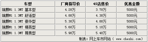 據(jù)奇瑞瑞麒4S店銷售人員介紹,目前瑞麒M1只在專屬瑞麒4S店內(nèi)銷售,其它奇瑞的4S店并沒有這款車的銷售權(quán)。現(xiàn)在瑞麒M1精英版及1.0車型已經(jīng)到店銷售,店內(nèi)1.3L的M1車型已經(jīng)非常齊全,并且顏色較為豐富。目前購買1.3L瑞麒M1現(xiàn)金方面可優(yōu)惠5000元。