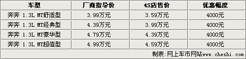 據(jù)長安轎車4S店銷售人員介紹,奔奔目前現(xiàn)車都比較齊全,但與上月相比,優(yōu)惠幅度明顯有所減少。目前奔奔1.3L四款車型只能優(yōu)惠4000元,比前一段時間少了1000元。但銷售人員也表示,如果消費者到店詳談,還可能有進一步優(yōu)惠的余地。