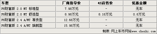 據(jù)比亞迪4S店銷售人員介紹,目前比亞迪F6只有2.0L手動舒適型有現(xiàn)車銷售,可以優(yōu)惠8000元現(xiàn)金,如果到店詳談還可以有更多的優(yōu)惠政策。而2.0L手動標(biāo)準(zhǔn)型因為配置較低,北京市場一直就沒有現(xiàn)車;2.4L車型也需要預(yù)定,交付訂金后需等半個月左右即可提車。