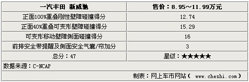 該車1.6L級別兼顧強(qiáng)動力與低油耗的雙VVT-i發(fā)動機(jī),最大功率87千瓦,最大扭矩150牛•米,綜合工況下的百公里油耗為6.7至7.1升,還配有GOA車身、帶EBD(電子制動力分配系統(tǒng))的ABS(防抱死制動系統(tǒng))等完備的安全性配置。