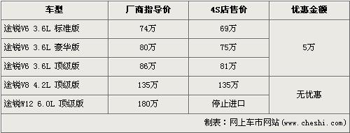 據(jù)經(jīng)銷商銷售人員介紹,途銳的旗艦車(chē)型W12缸的6.0L頂配型已經(jīng)停止進(jìn)口。而3.6L的車(chē)型有5萬(wàn)元的優(yōu)惠,最低配的3.6L標(biāo)準(zhǔn)型的售價(jià)從74萬(wàn)元下跌到了69萬(wàn)元,首次跌破了70萬(wàn)元。4.2L頂級(jí)版由于店內(nèi)沒(méi)有現(xiàn)車(chē)所以沒(méi)有優(yōu)惠,欲購(gòu)買(mǎi)的消費(fèi)者需交訂金10萬(wàn)元,約等2個(gè)月才可提車(chē)。